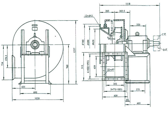 三、4-68N06.3D、C离心通风机安装及外形尺寸图