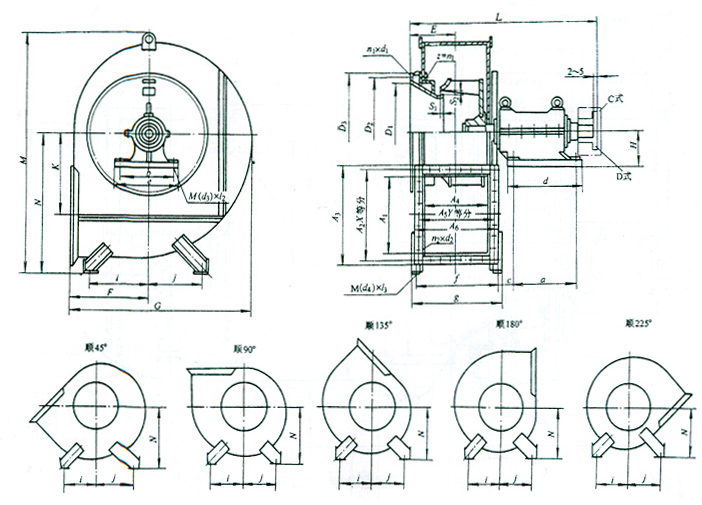 四、4-68N08、10、12、5D、C离心通风机安装尺寸图